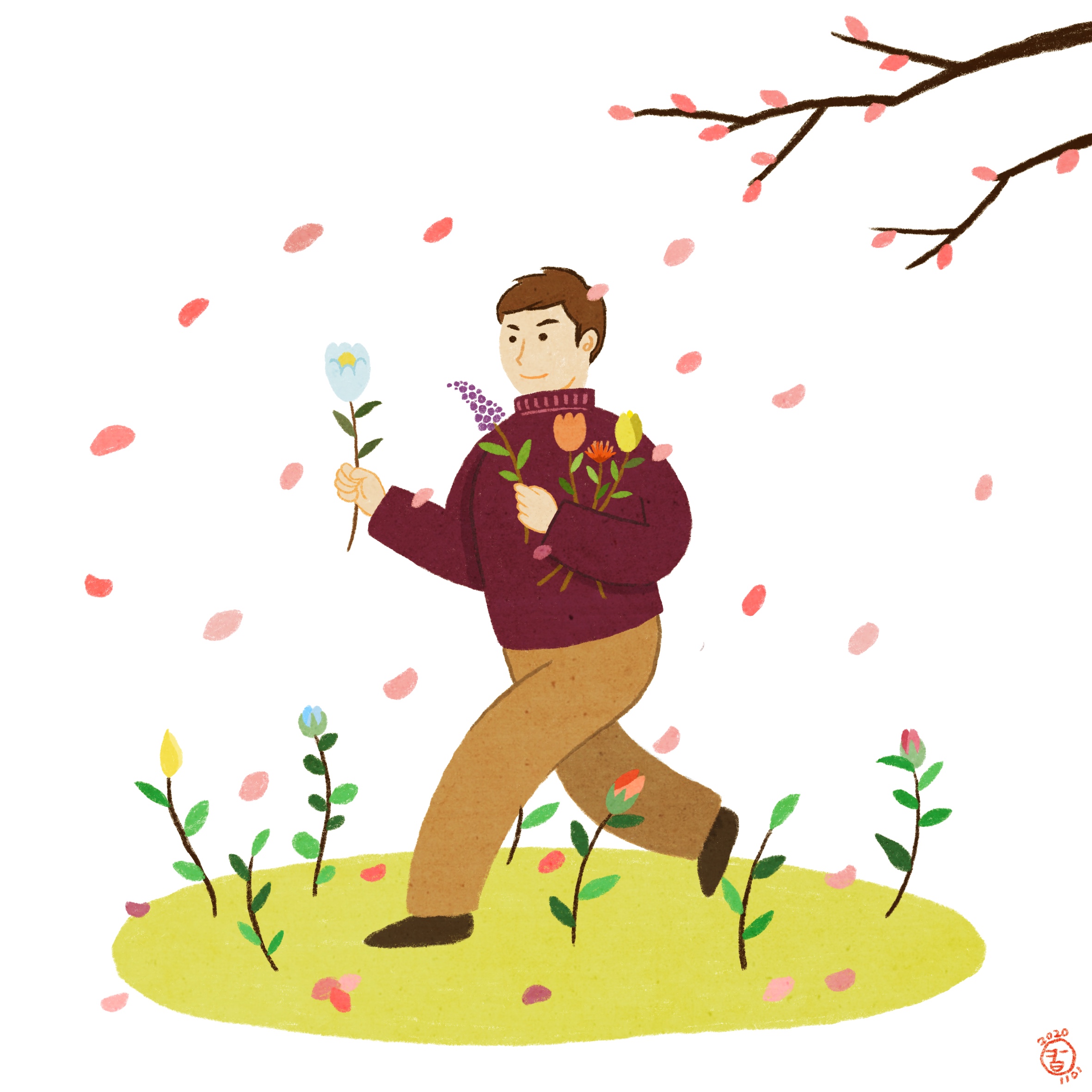 품 안에 꼭 안고있는 꽃들은 이제까지의 연애를 통해 나에게 남은 것들을 활짝 핀 꽃으로 표현했다. 걷고 있는 길에 놓인 꽃가지들은 앞으로의 연애를 나타내며 꽃 피우기 전의 꽃망울을, 힘찬 걸음걸이를 통해 더 많은 경험을 하기 위해 기꺼이 앞으로 나아가겠다는 의지를 표현했다.