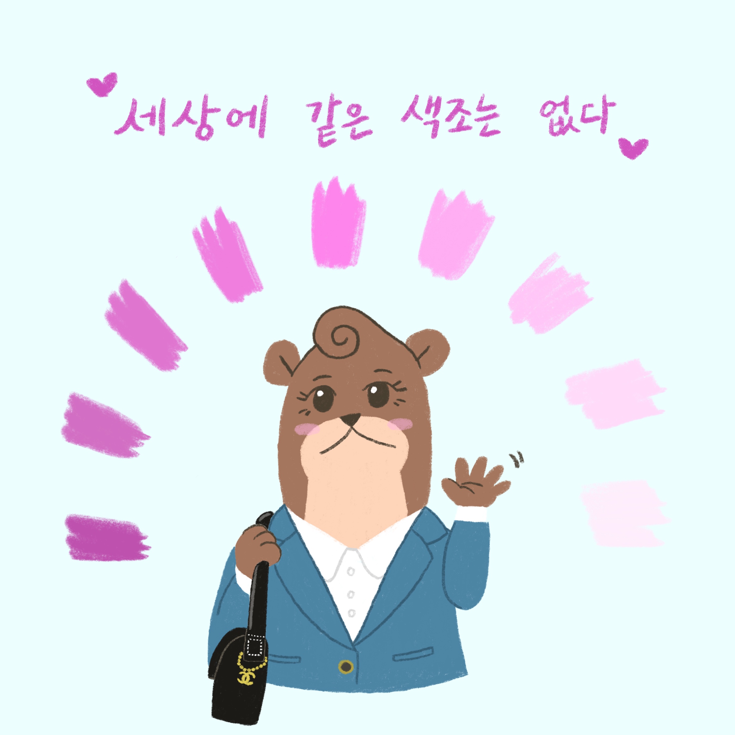 '하늘 아래 같은 색조는 없다.' 핑크는 여러 갈래로 나뉜다며 다 다른 색조임을 강조하는 캐릭터를 그려보았습니다.