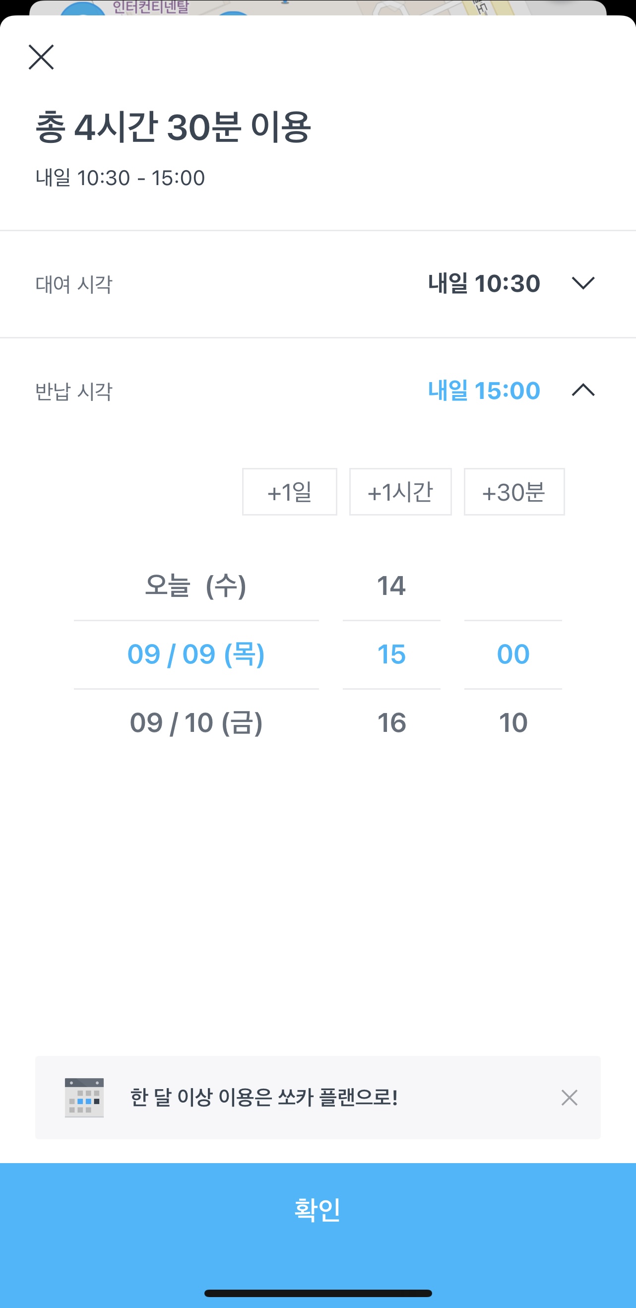 기본 대여시간은 30분 이상이며, 10분 단위로 설정이 가능합니다.