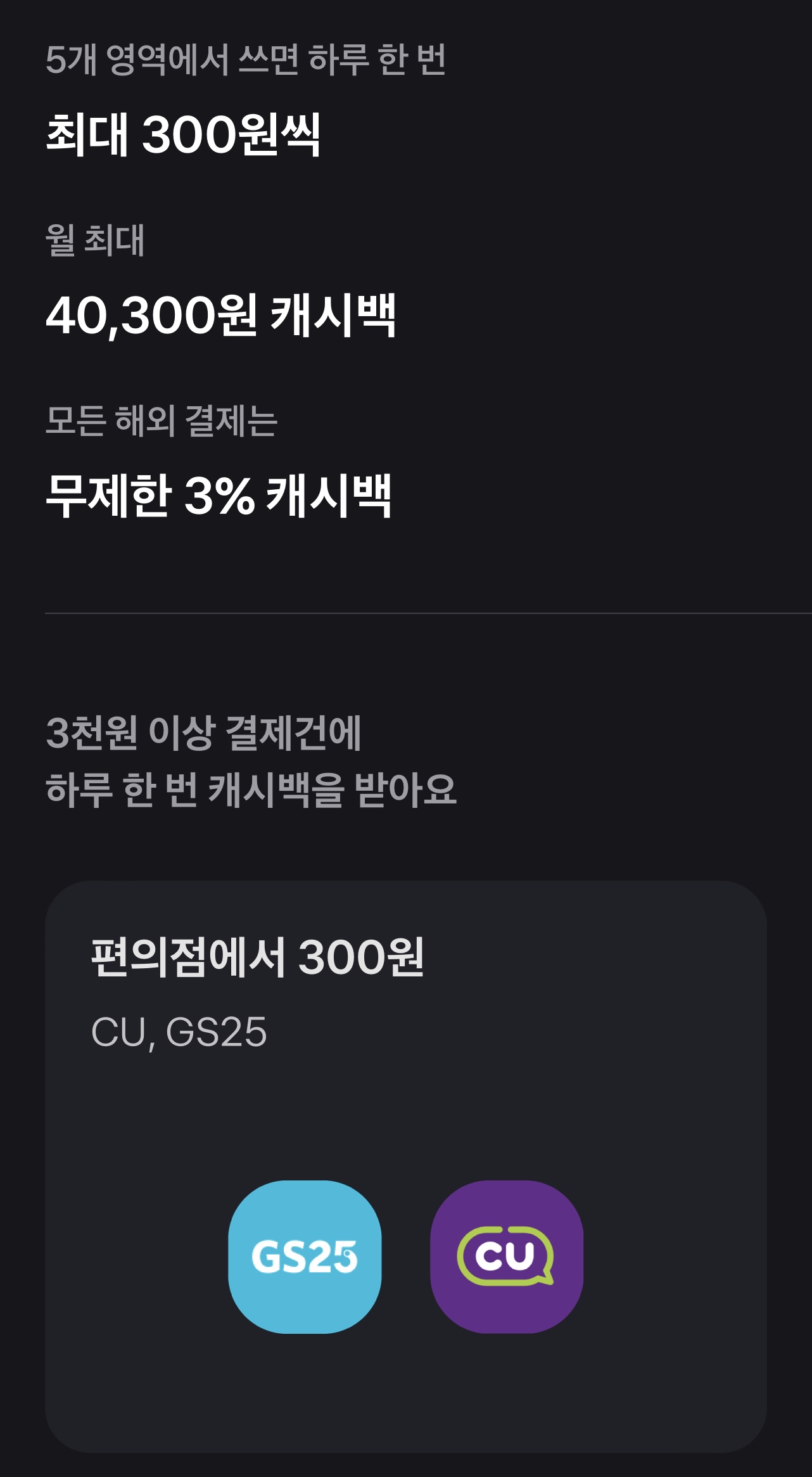 편의점은 아쉽게도 혜택 축소 * 해외 결제에도 혜택이 적용되는지는 몰랐네요!