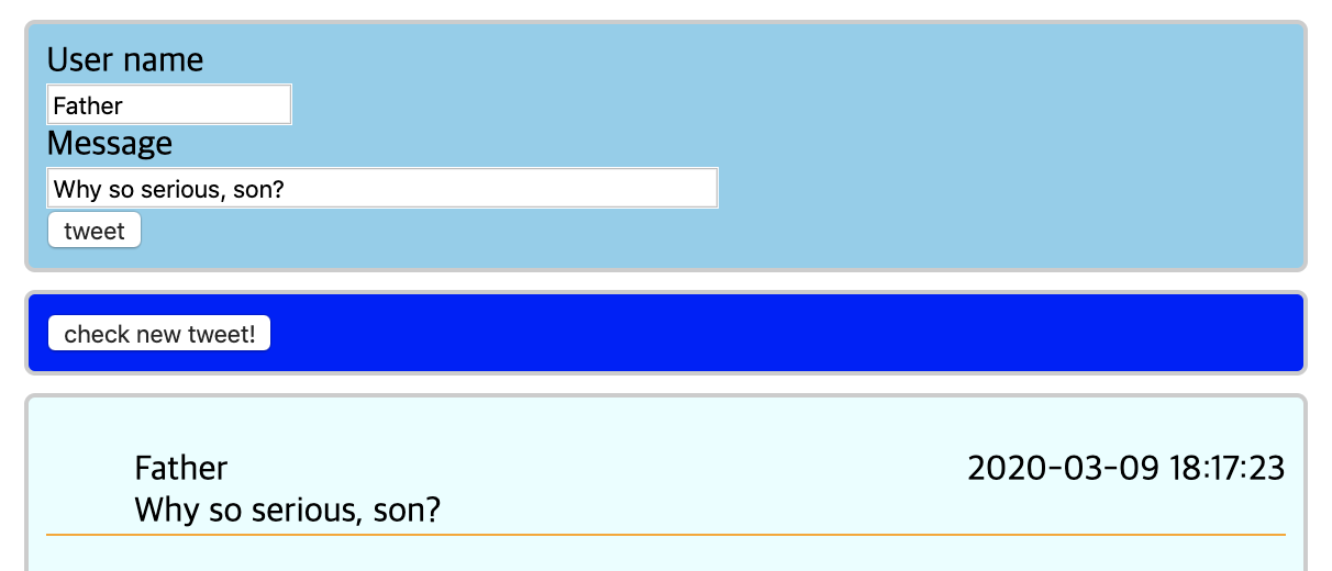다음 포스팅에서는 "check new tweet!" 이라는 버튼을 클릭하였을 때,