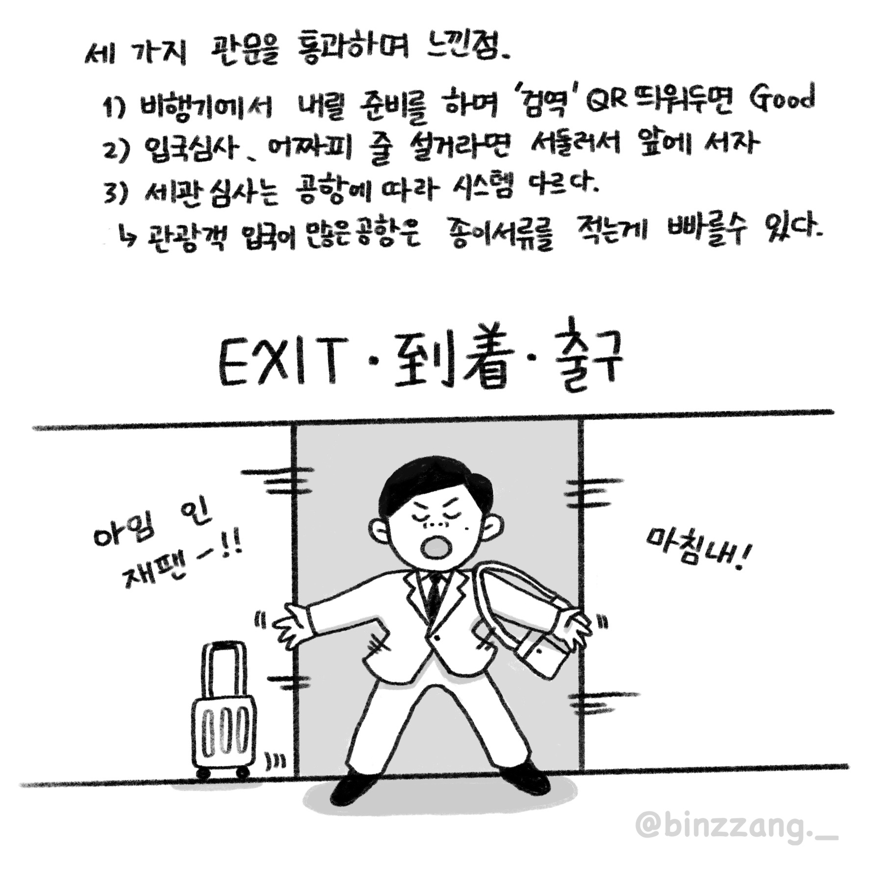 입국심사는 줄을 얼마나 빨리 서느냐에 따라 출구 통과 속도가 결정됩니다. 우리 모두 비행기 착륙하면 스마트폰 켜고, 안전벨트 풀고 대기하잖아요? (안전을 위해 안전벨트 해제는 권장하지 않습니다.) 비행기에서 내리면 우선 최대한 빠르게 입국심사장의 방향을 파악하고 서둘러 이동하는 것이 중요합니다. (이때, 검역정보를 미리 열어두지 않고 서두르다가는 공항 직원들에게 잡힐 수 있으니 주의하시고요.)