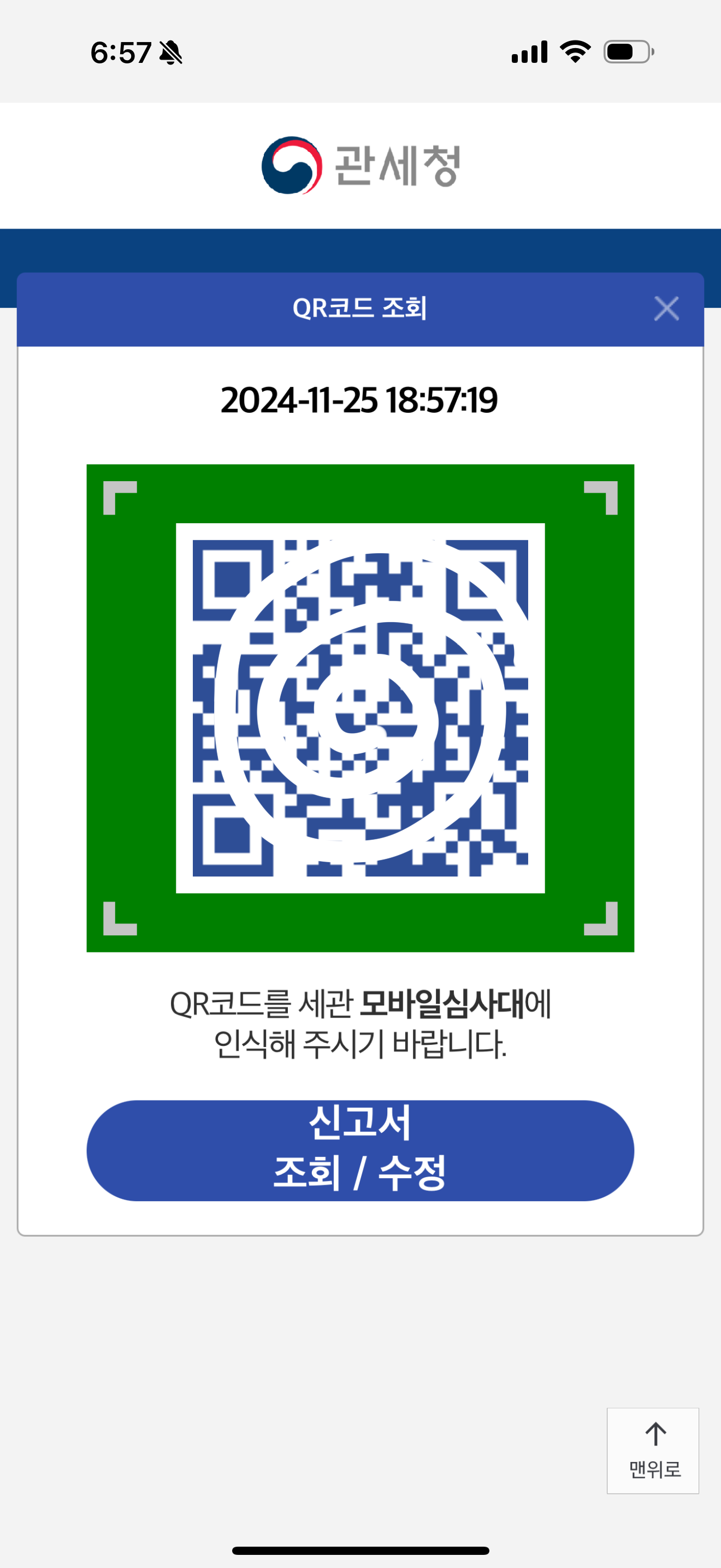 정보 입력을 마치고 나면 한국에 돌아왔을때 간편하게 신고할 수 있는 QR코드가 나옵니다. 따로 캡쳐하지 않아도 다시 앱을 켜면 신청서 조회 메뉴를 통해 미리 등록해둔 내역이나 QR코드를 확인할 수 있었어요.