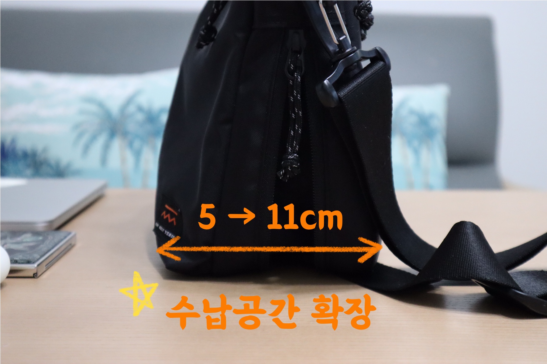 가방 아래쪽에 배치된 지퍼를 끝까지 열어주면, 폭이 5cm에서 11cm까지 확장됩니다.