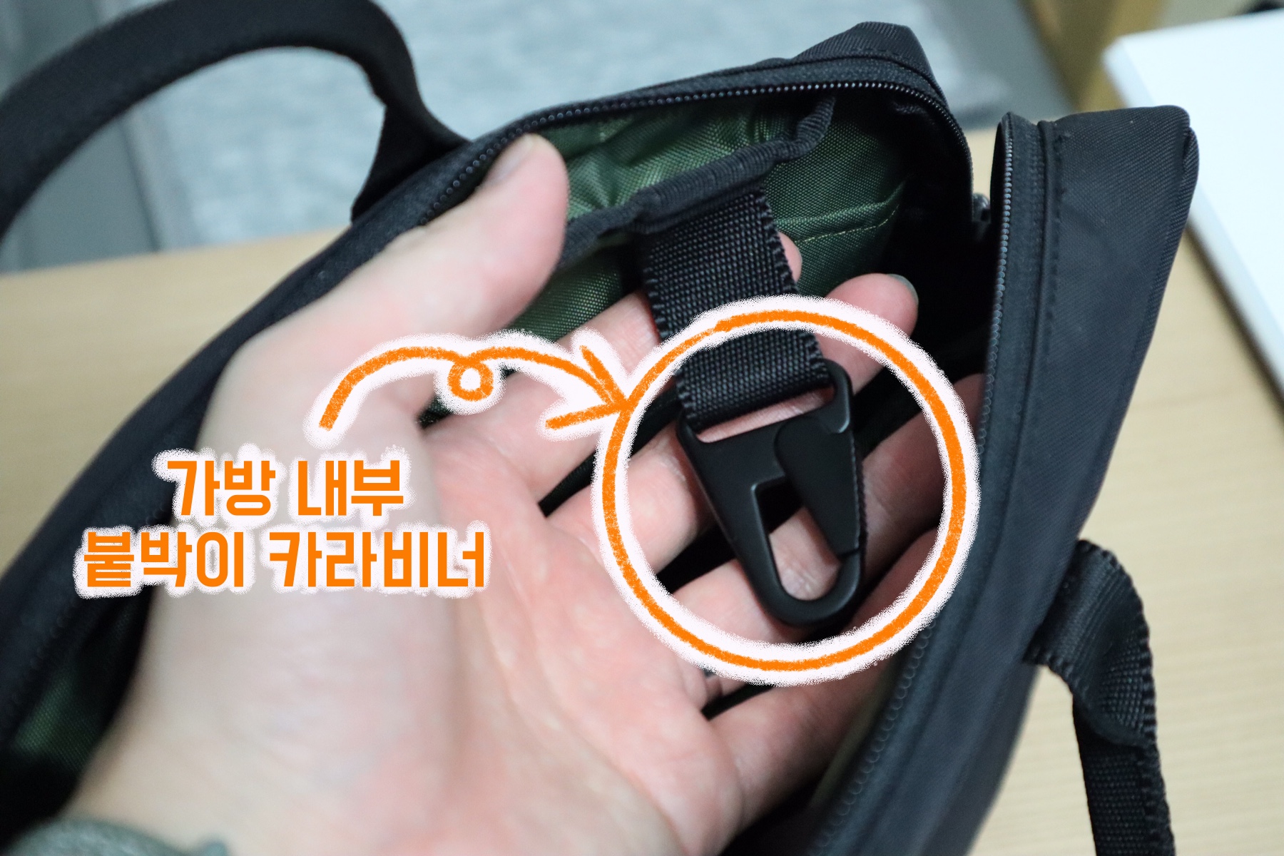 이런 다양한 수납공간 배치, 빠져든다. 가방 안쪽에는, 카라비너가 하나 더 달려있습니다.