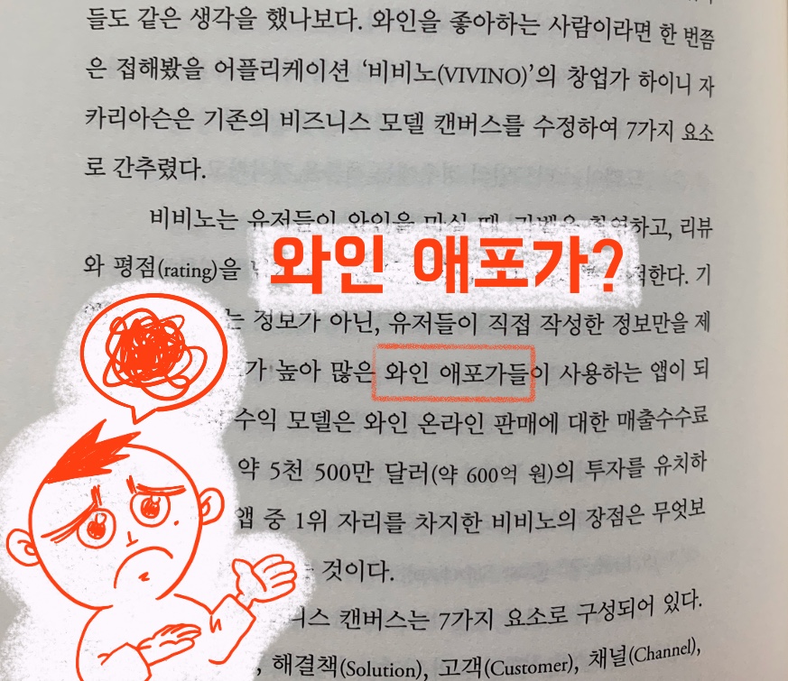 스타트업 정신을 이야기하며, 많은 사례들을 소개하는 파트를 읽고 있었다. 소비자가 스스로 고른 와인에 별점을 줄 수 있는 애플리케이션 서비스를 개발한 사례가 등장하며, 와인에 대해 관심을 갖는 인구가 늘었다는 표현을 적어 내려 가는 중에 와인 '애포가'라는 단어가 등장했다. 한참 '애포가'라는 단어를 들여다보고 있었다. 혹, 내가 모르는 단어가 있을지도 모른다고 스스로를 설득하기도 해 봤는데 끝내 스마트폰을 꺼내 검색까지 해보고서 알게 되었다. 오타였다.